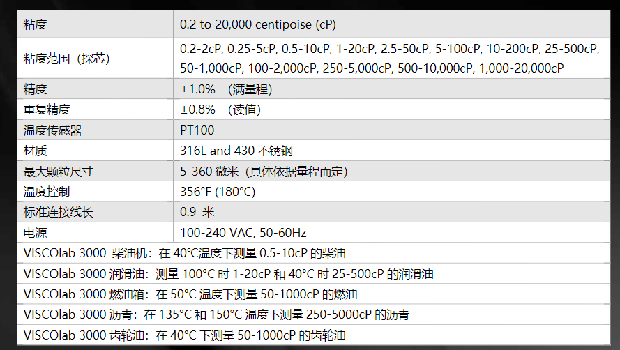 小樣品粘度計集成了一個電子加熱器和綜合的溫度控制系統,可提供連續的粘度和溫度讀數可在12個20:1粘度范圍內進行測量。粘度可顯示為CP或CST,溫度可顯示為°C或°F。集成溫度控制允許用戶在高于環境溫度至356°F(180°C)和高于環境溫度至-40°C的任意設置下進行測量,并配備可選的冷卻套。該傳感器易于現場校準。可以預先校準多個工作范圍和產品設置。數據可以通過RS-232串行端口輸出到PC,用于跟蹤、存儲或圖形顯示。電子設備允許用戶定義溫度和粘度顯示單位、數據平均間隔、密度等。電子設備還提供數字讀數,以及樣本穩定性的統計數據,使測試和操作員之間具有更大的重復性。主要特征易于使用和維護 cP和cst的數字顯示 存儲多達40個特定于產品的測試設置 可拆卸的溫控循環套和蓋子增強功能 所需液體少于2ml,最大限度地減少產品浪費 需要少量的工作臺空間 便攜 內部加熱器,用于溫度控制在40/50/100/135/150°C等各種條件高精度和可靠性 軟件多次測量樣品,直到標準偏差小于0.2%,然后根據ASTM D7483顯示粘度值適用范圍0.2至20000cP的粘度測量值標準方法符合ASTM D7483標準 相關于ASTM D445標準。